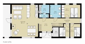 I hyttemodellens planløsning er det lagt vekt på funksjonelle og praktiske løsninger for den aktive familien. Hytta er sonedelt med et raust inngangsparti med våtrom, egen oppholdssone og soveromsavdeling med hems.