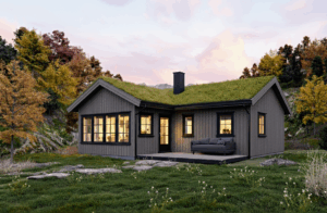 Byggesettet leveres på tomten og våre snekre gjør den ferdig utvendig og nødvendige innvendige bæringer i tre.