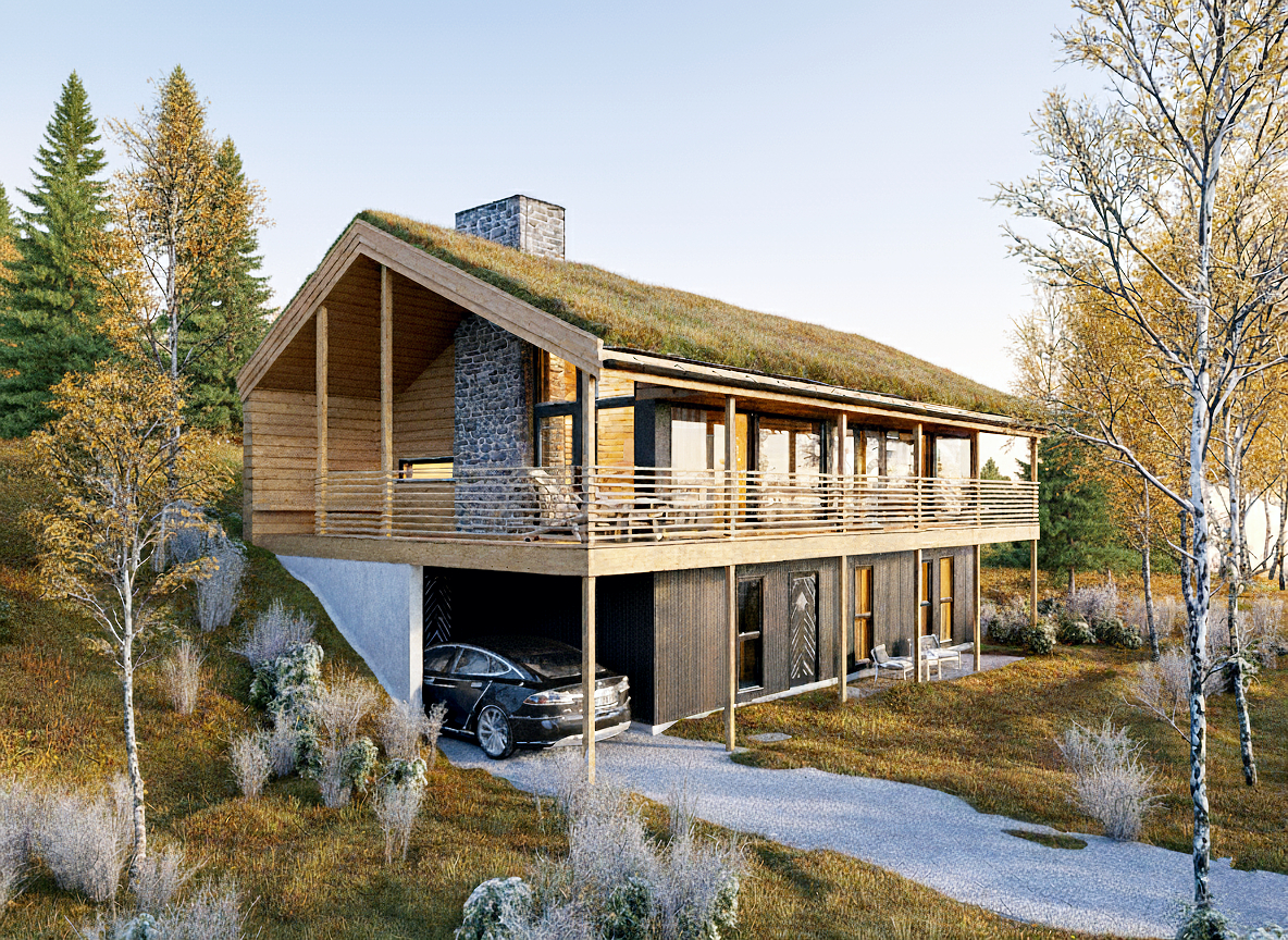 Hytte Tor er ei stor familiehytte med gode overbygg og carport. Hytta er tilpasset skrått terreng.