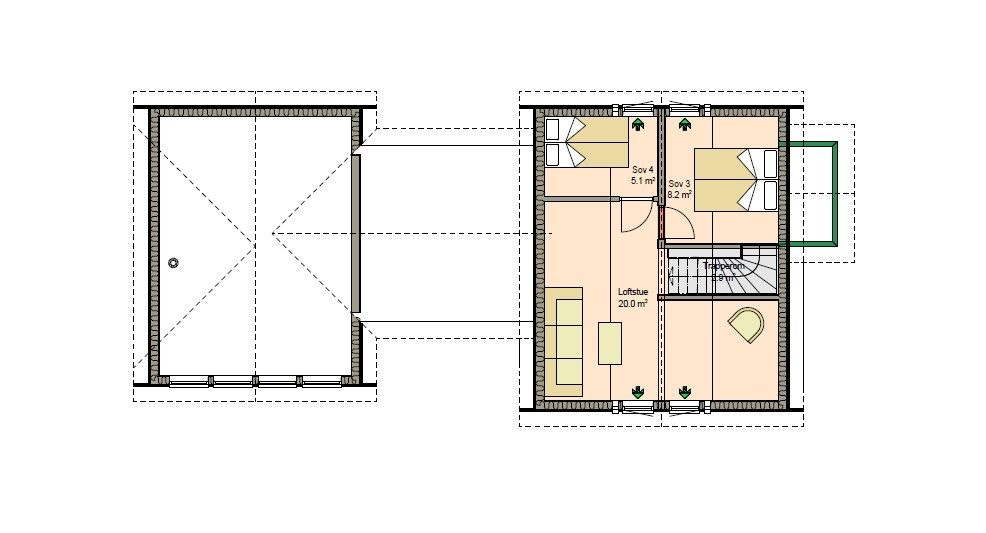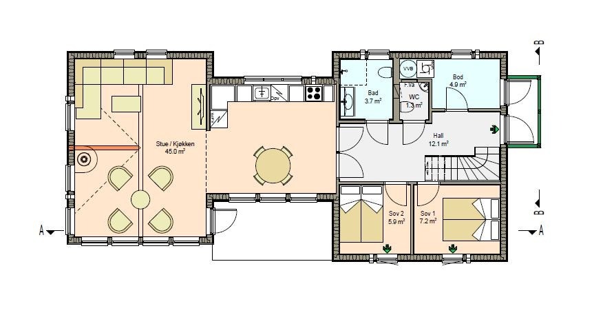 Hytta inneholder en stor stue med eget, åpent rom for kjøkken, bod med egen inngang som kombineres med vaskerom og tekniske installasjoner, gjestetoalett med praktisk inngang fra entrè, to soverom og ett bad. Oppe i 2 etasje kommer du inn i en god loftstue og 2 soverom.