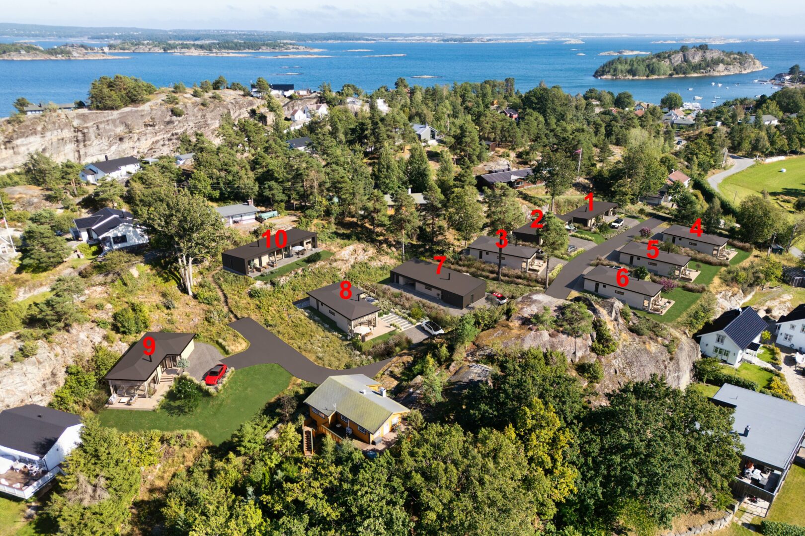 På tomteplanen ser du hvordan tomtene er plassert i forhold til hverandre og sjøen. Hver tomt er planlagt for å sikre optimal utsikt, gode solforhold og privatliv.