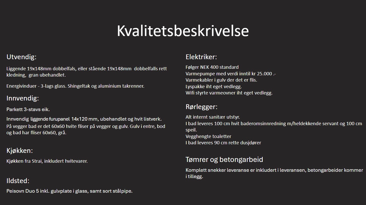 Nøkkelferdig leveres hytten klar til innflytting i henholdt til leveransebeskrivelse. Det er medtatt snekker for hele prosjektet, rørlegger, elektriker, legging av parkett, flis og kjøkken. Her er det bare til å ta med seg møbler og flytte inn.