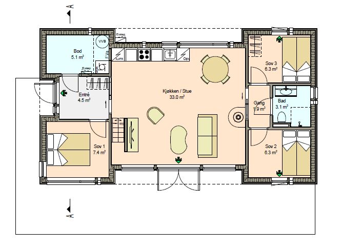 Denne hytten kan vi tegne om slik at den passer akkurat din tomt og dine ønsker, Kanskje vil du ha et ekstra gjestetoalett, badstue eller overbygd terrasse? Kanskje du vil ha en lengre og større hytte?